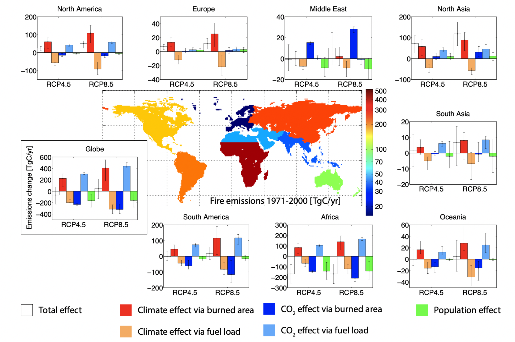 Figure 16 | Region-by-region projections of change in fire activity as measured by emissions of carbon (TgC/yr) from Knorr et al., 2016. The impact on total change is decomposed into 5 factors and is shown for a high future greenhouse gas emissions scenario (RCP8.5) and a medium future CO2 emissions scenario (RCP4.5).